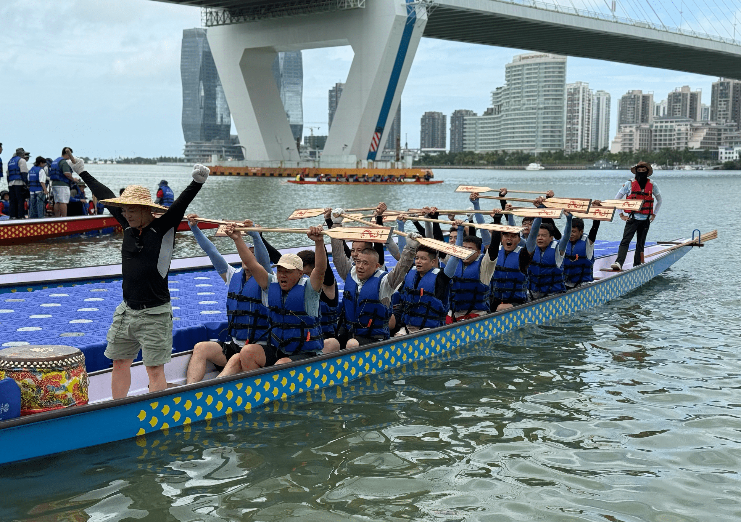 “一、二!一、二!”,槳板劃破平靜的水面,口號聲與鼓點(diǎn)交織,海南民生燃?xì)恺堉坳牭拇黼S浪起伏,隊員們的后背早已被汗水和海水浸透,盡管腰腹和腿部即將力竭,但大家仍在揮動劃槳,無人停下——為迎戰(zhàn)5月31日開賽的2025“??诒?rdquo;端午國際龍舟邀請賽,這支由燃?xì)庖痪€工作者組成的隊伍頂著烈日驕陽在200米直道中反復(fù)錘煉默契。二十余名隊員從零起步,在首次合練時槳葉打架、船體打轉(zhuǎn),如今卻能以精準(zhǔn)的節(jié)奏、高效的合作一起乘風(fēng)破浪,用民生人“使命必達(dá)”的執(zhí)著,詮釋“競速爭流”的團(tuán)隊凝聚力。